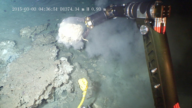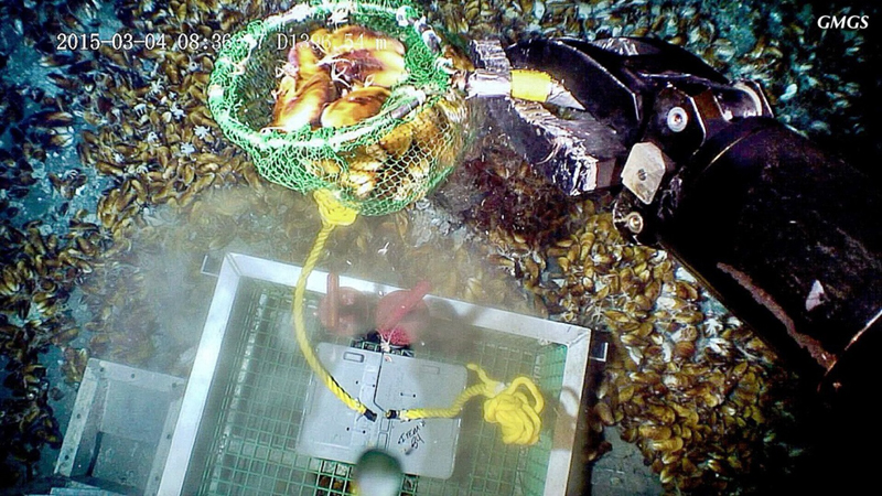 “海马”号在“海马冷泉”进行取样(上图为贻贝,下图为碳酸盐结壳)